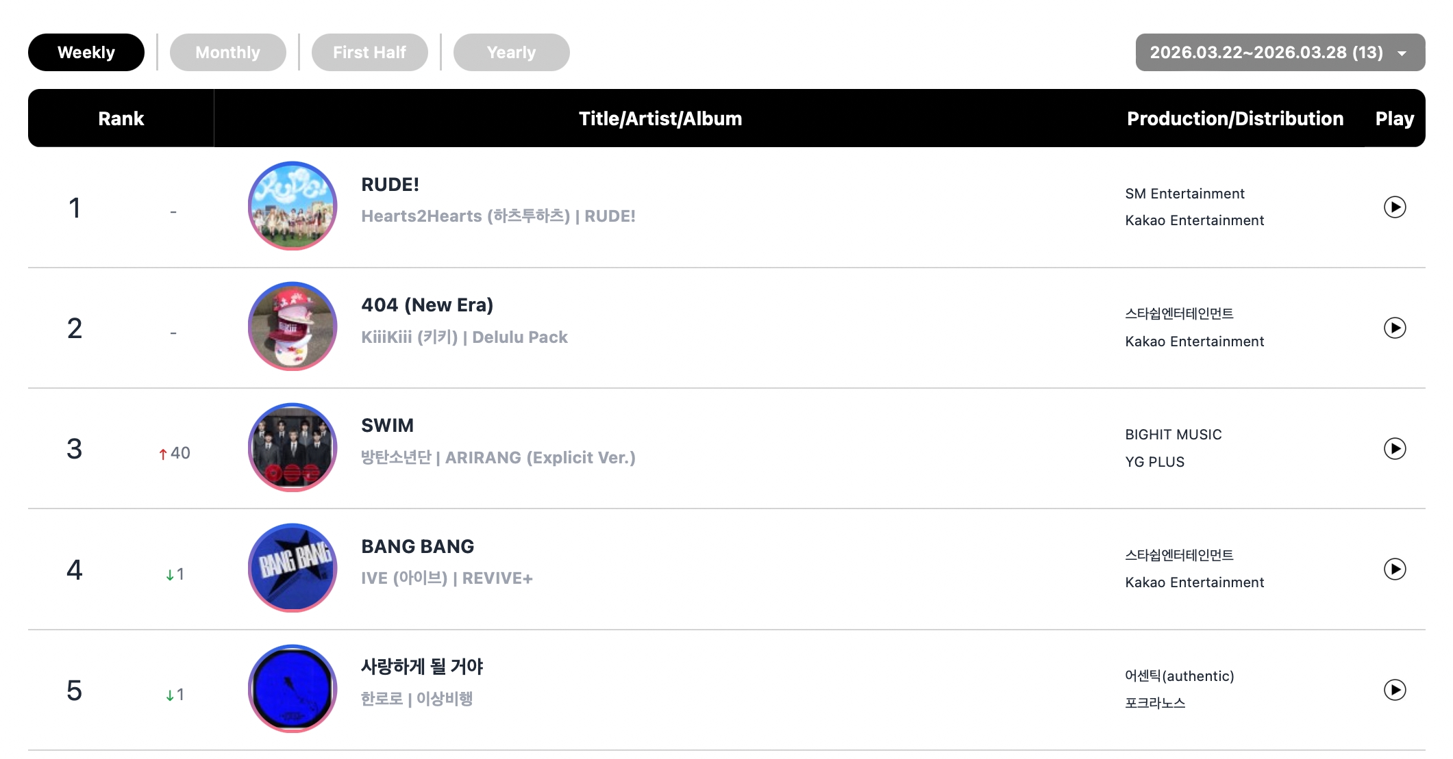 ’s “BANG BANG” at No. 4 and HANRORO’s “Landing in Love” at No. 5.