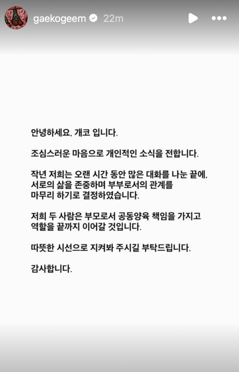 On January 16, Gaeko posted a statement on his Instagram Story announcing that he and his wife Kim Su Mi had decided to end their marriage after careful consideration.