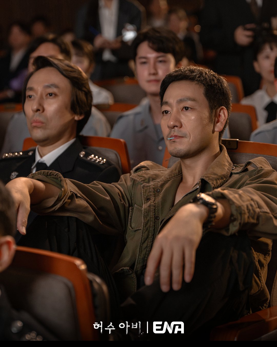 The new stills show Kang Tae Joo’s rough presence. Among neatly uniformed police officers, he stands out immediately with his jacket open and a free-spirited air. Sitting with his legs up on a chair and a lollipop in his mouth, he gives off a clearly unusual vibe.