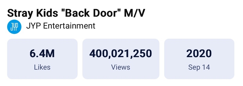 originally released “Back Door” on September 14, 2020 at 6 p.m. KST, meaning that the song took approximately 5 years, 5 months, and 21 days to hit the 400 million mark.
