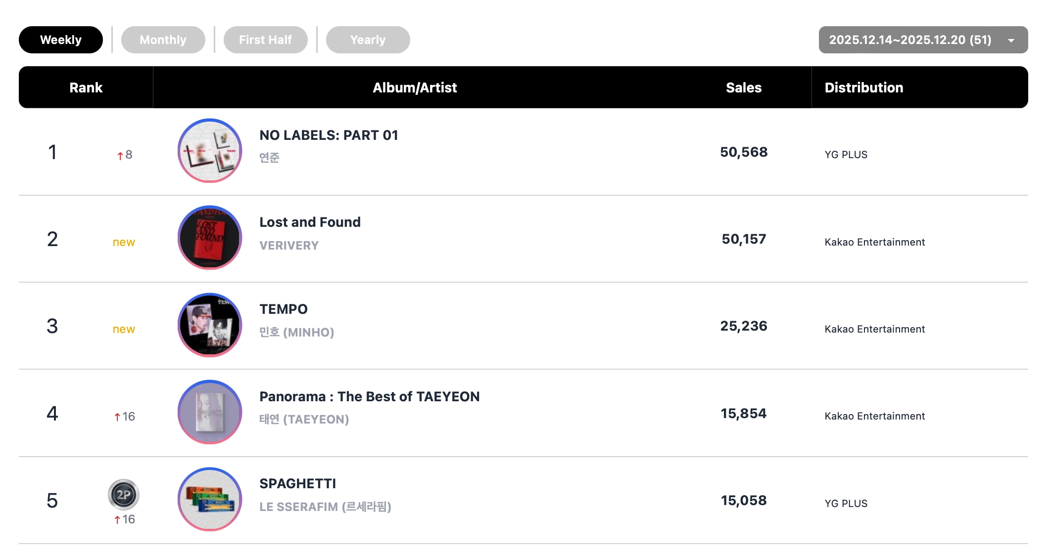 TXT’s Yeonjun topped this week’s physical album chart with his solo mini album “NO LABELS: PART 01,” which returned to No. 1.