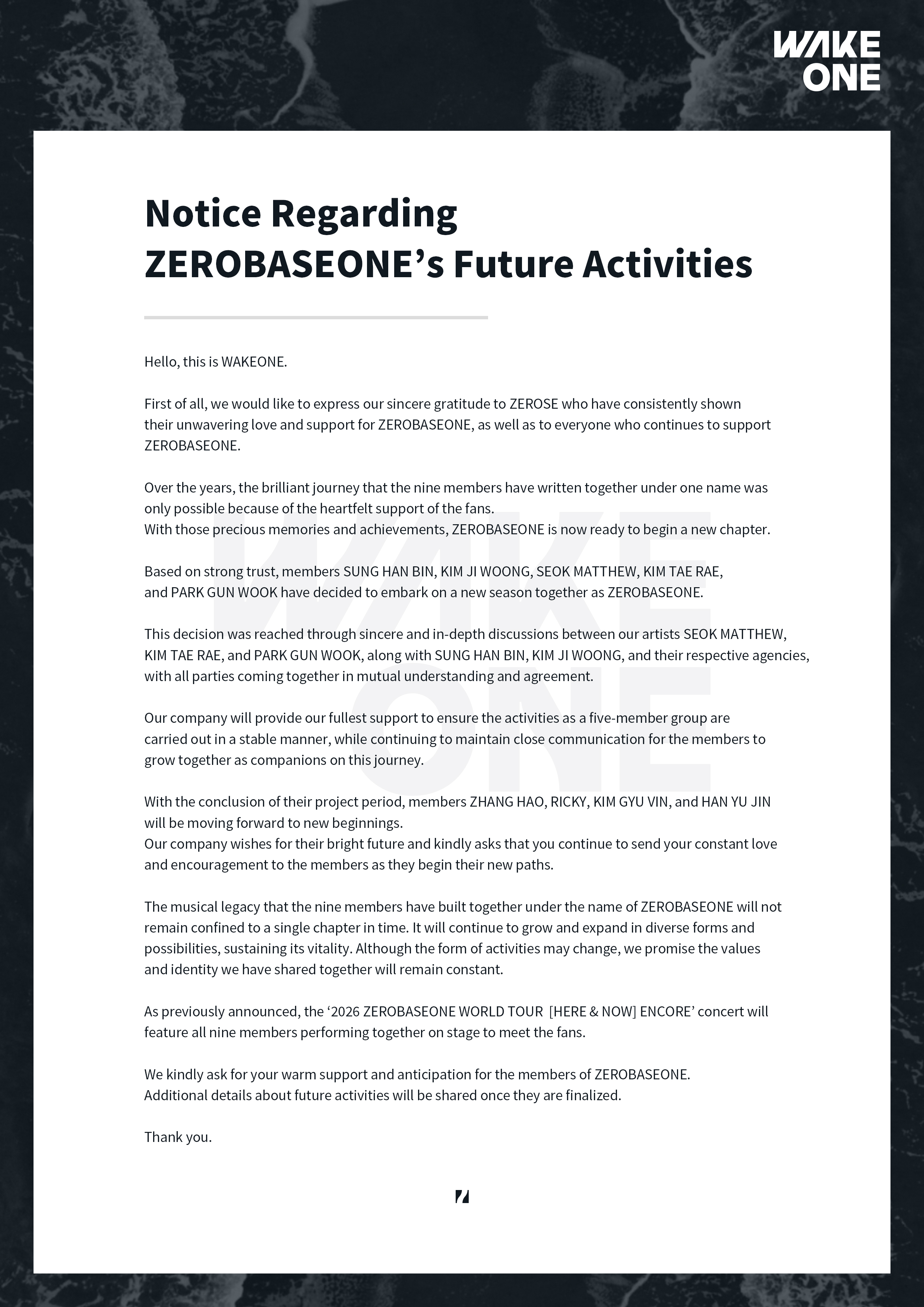 Quick summary- 1ZEROBASEONE will continue activities as a five-member group, with WAKEONE confirming which members will remain and describing it as a “new season” for the group